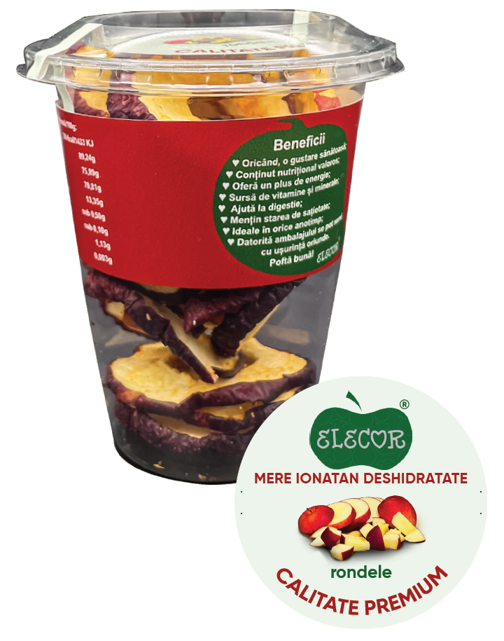 Valoare nutrițională: Merele deshidratate conțin vitamine, minerale și fibre care ajută la menținerea sănătății organismului și a unei diete echilibrate.